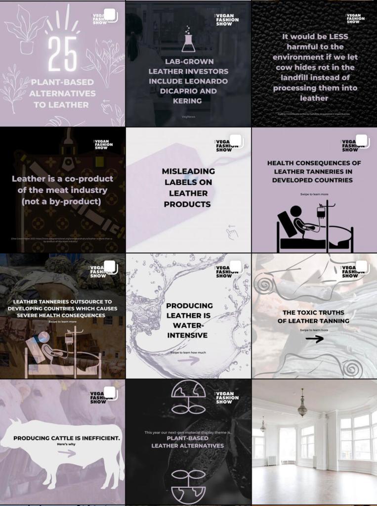 Below is a grid layout of the social media campaign I designed to promote plant-based leather alternatives for The Vegan Fashion Show.