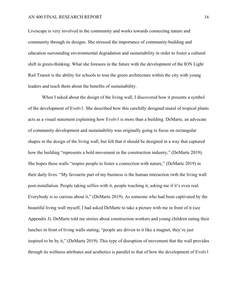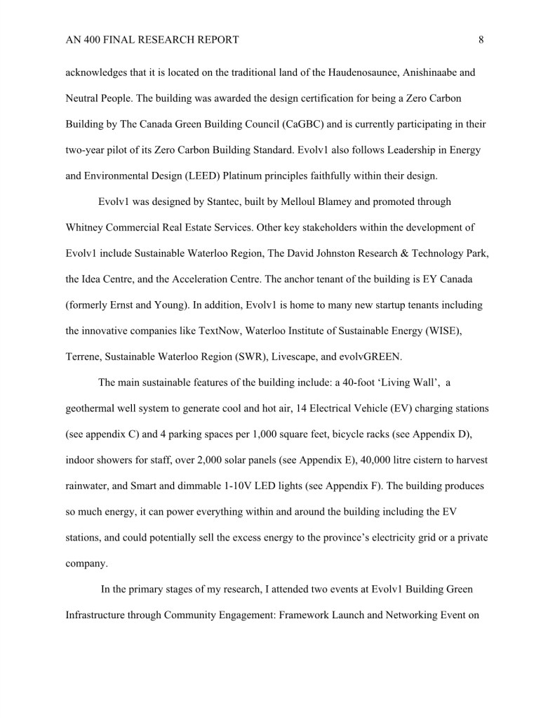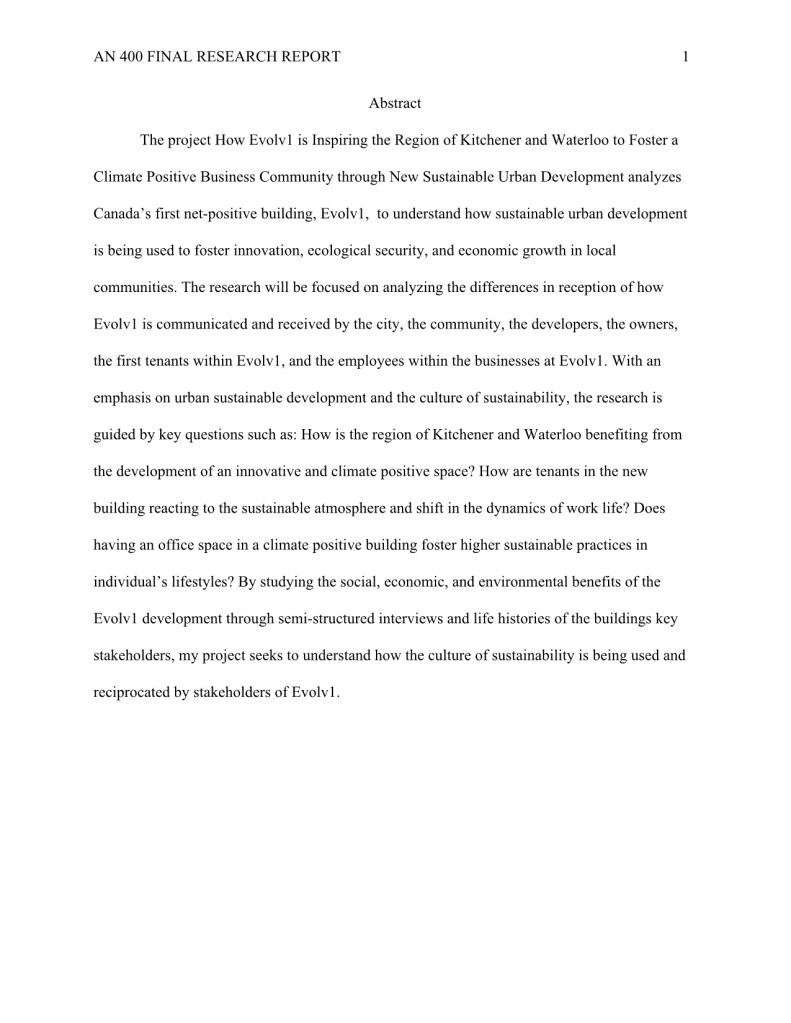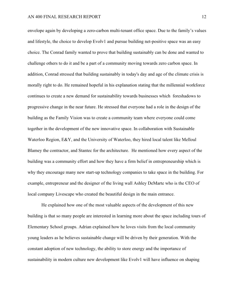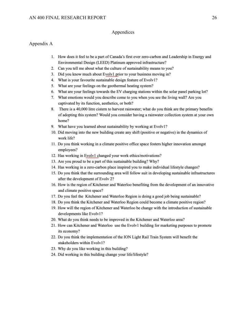 My research “How Evolv1 is Inspiring the Region of Kitchener and Waterloo to Foster a Climate Positive Business Community through New Sustainable Urban Development,” was completed during my undergraduate degree in Anthropology.