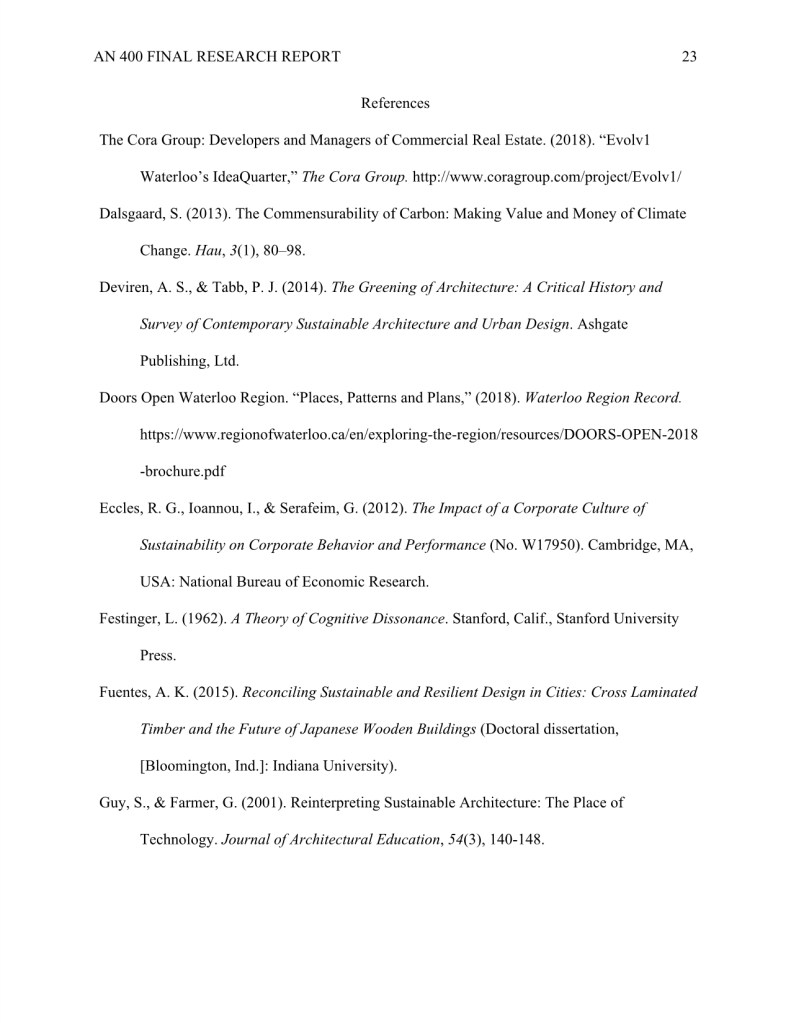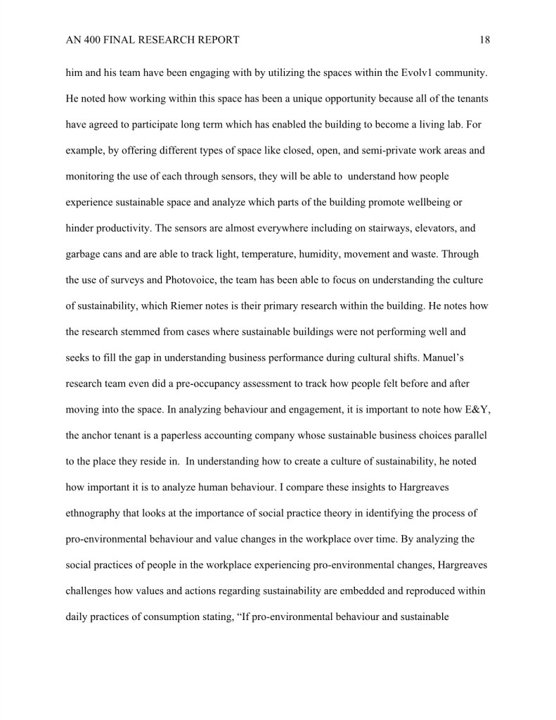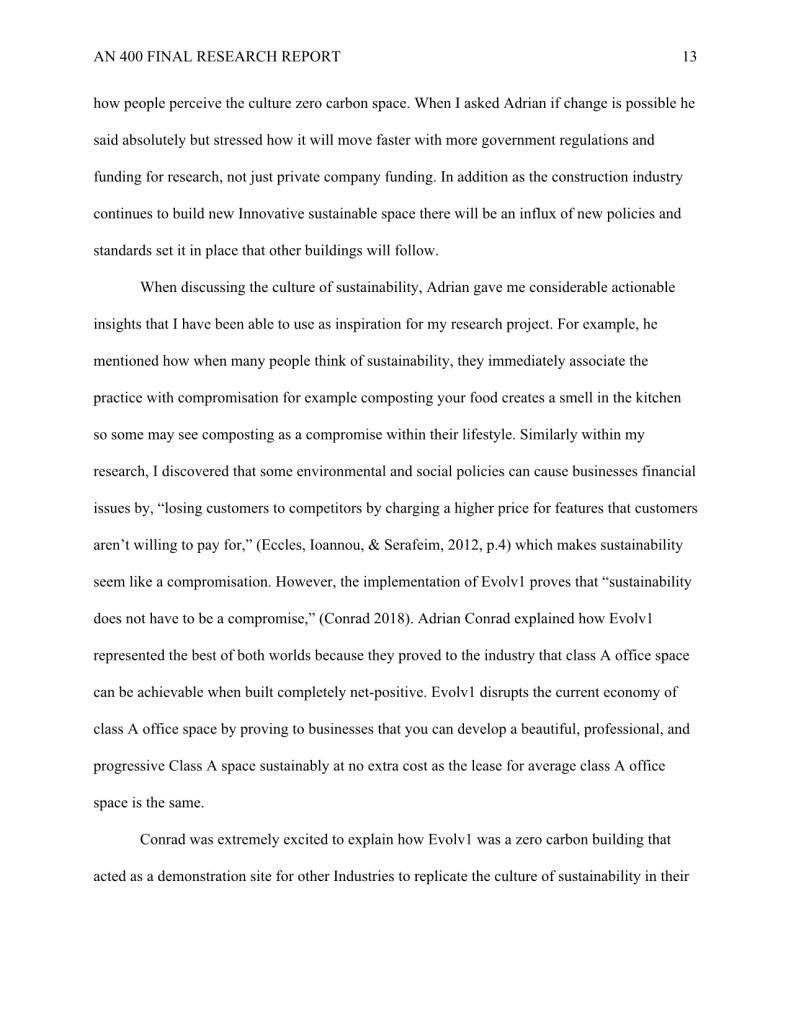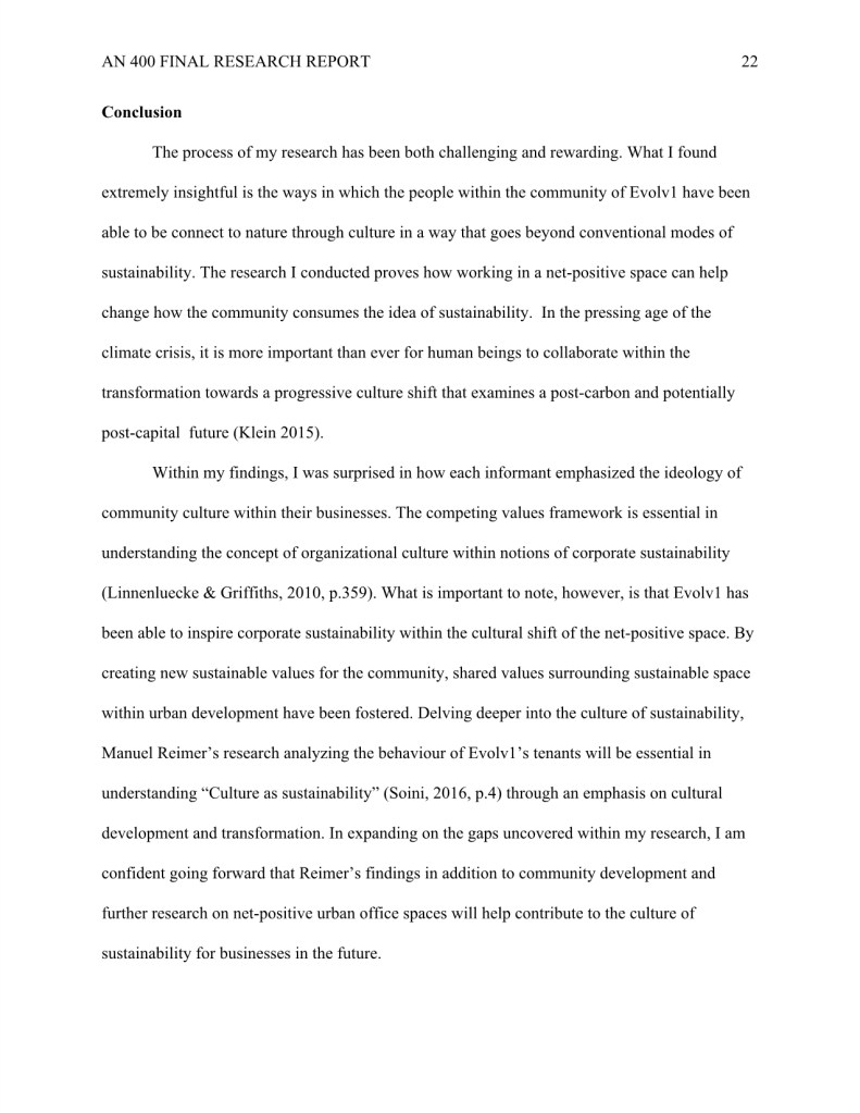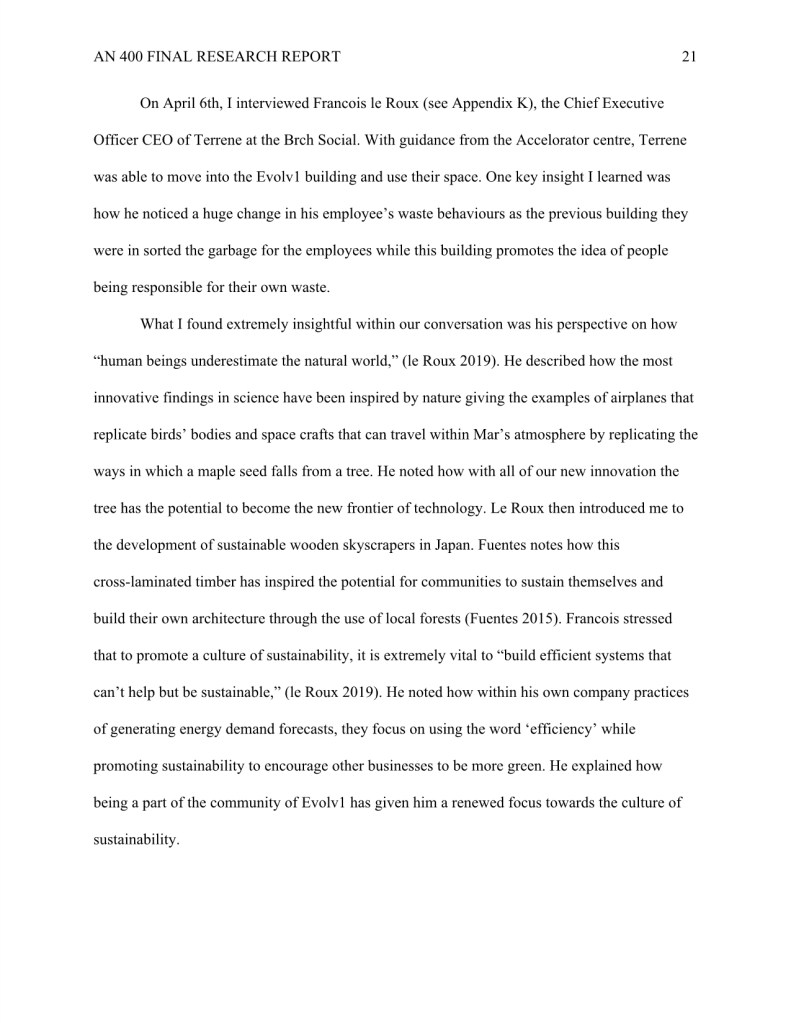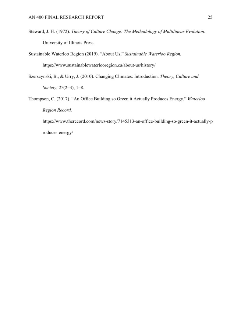 My research “How Evolv1 is Inspiring the Region of Kitchener and Waterloo to Foster a Climate Positive Business Community through New Sustainable Urban Development,” was completed during my undergraduate degree in Anthropology.