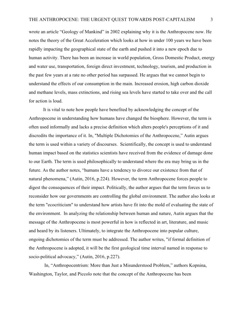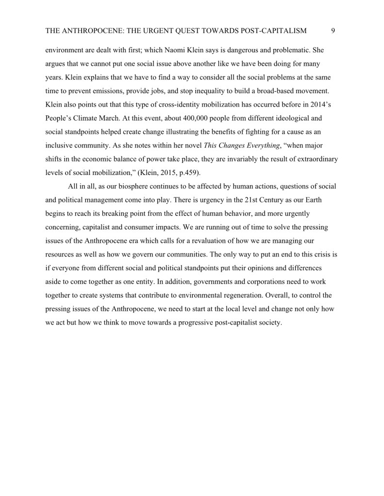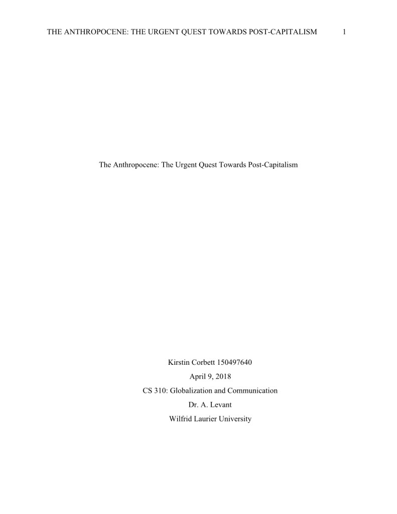 I wrote the research paper titled, “The Anthropocene: The Urgent Quest Towards Post Capitalism,” during my undergraduate degree in Communications. I later presented this research at the annual Laurier Undergraduate Journal of the Arts conference in 2018.